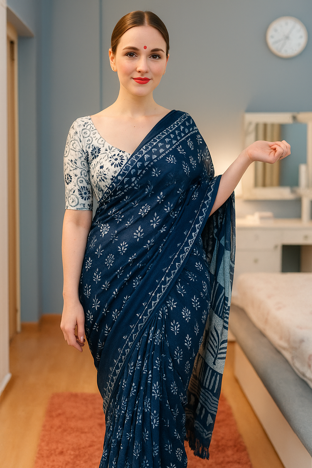 Midnight Blue Leaf Print Cotton SareeSaree Fabric : Cotton Blouse : Separate Blouse Piece Blouse Fabric : Cotton Pattern : Printed Blouse Pattern : Same...