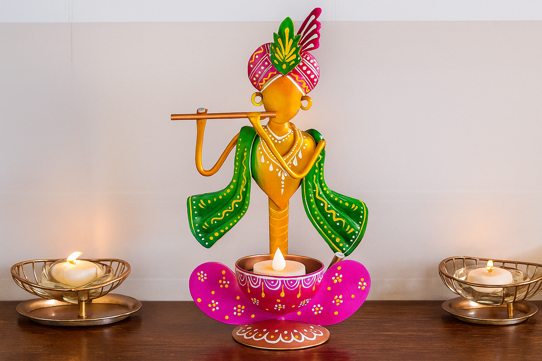 Metal Krishna Showpiece Tea Light HolderMaterial: MetalType: FigurineNet Quantity: 1Dimensions:• Height: 11.5 Inch• Length: 6.5...