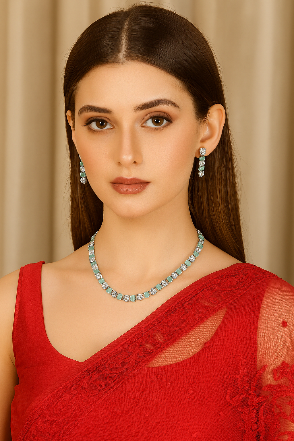 Celestial Emerald Necklace Set Base Metal : Alloy Plating : Silver Plated Stone Type : American Diamond Sizing : Choker Type : Necklace Net Quantity...
