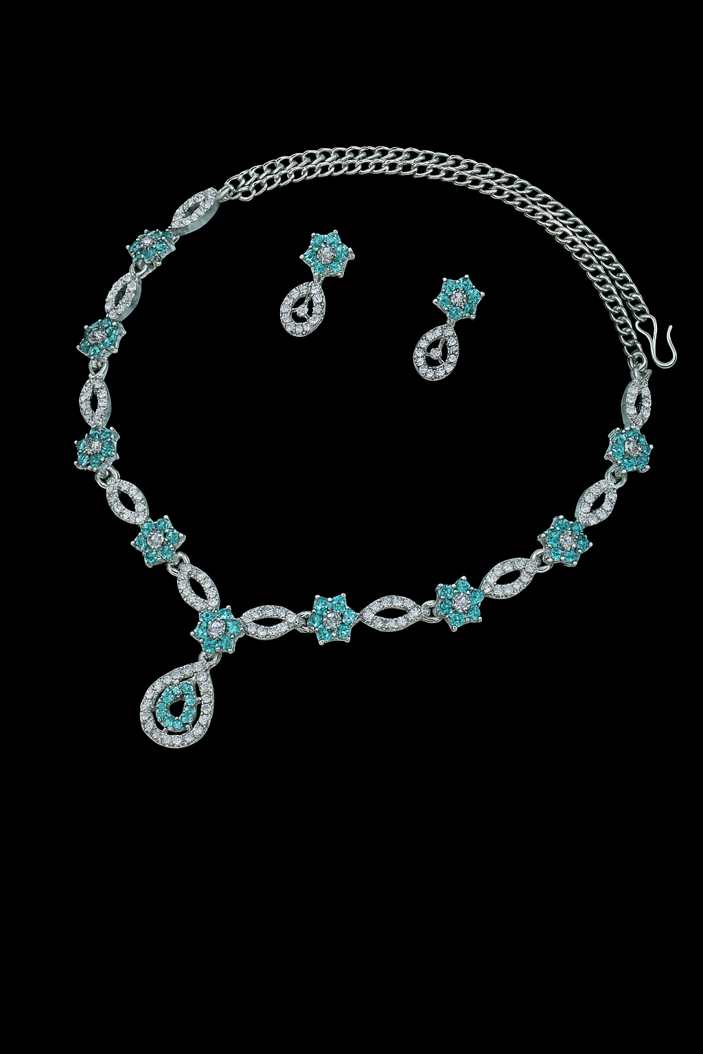 Elevate your style with this exquisite silver-plated floral necklace set, crafted from premium brass and adorned with sparkling cubic zirconia/American diamonds. Featuring a delicate arrangement of sky-blue and white stones, the design blends modern elegance with timeless charm.