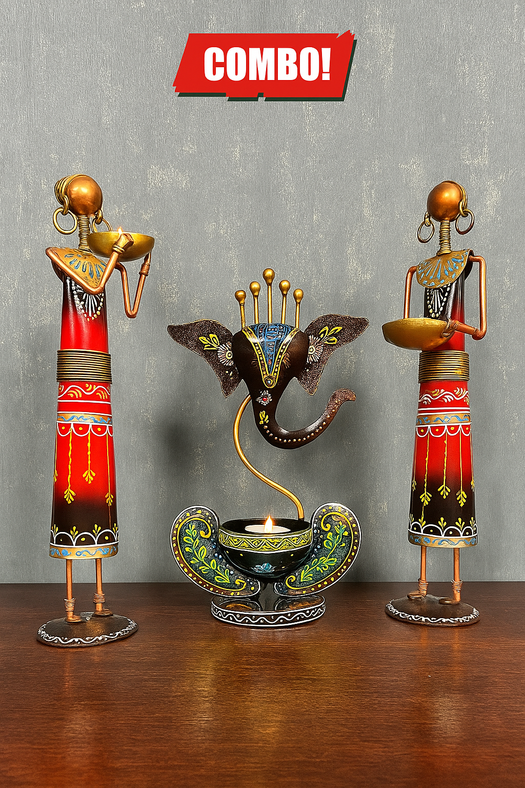Ganesha T-Light Holder with Iron Tribal Lady Figurines – Decorative Combo Set for Home Decor