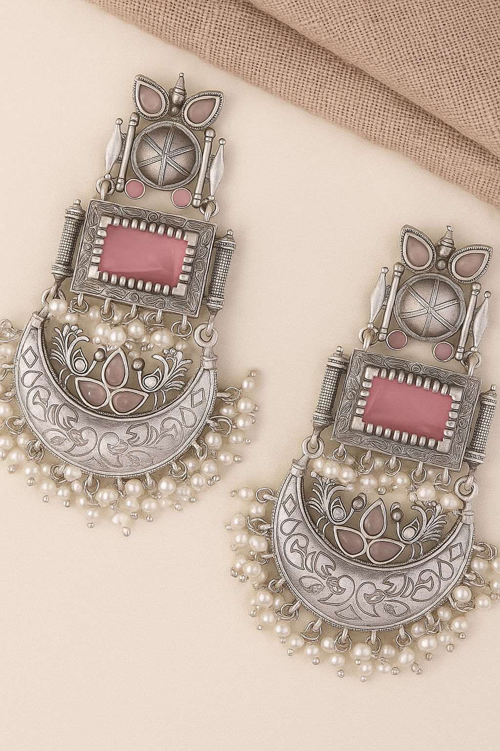 Oxidized Silver Chandbalis with Stones and Pearls Earrings