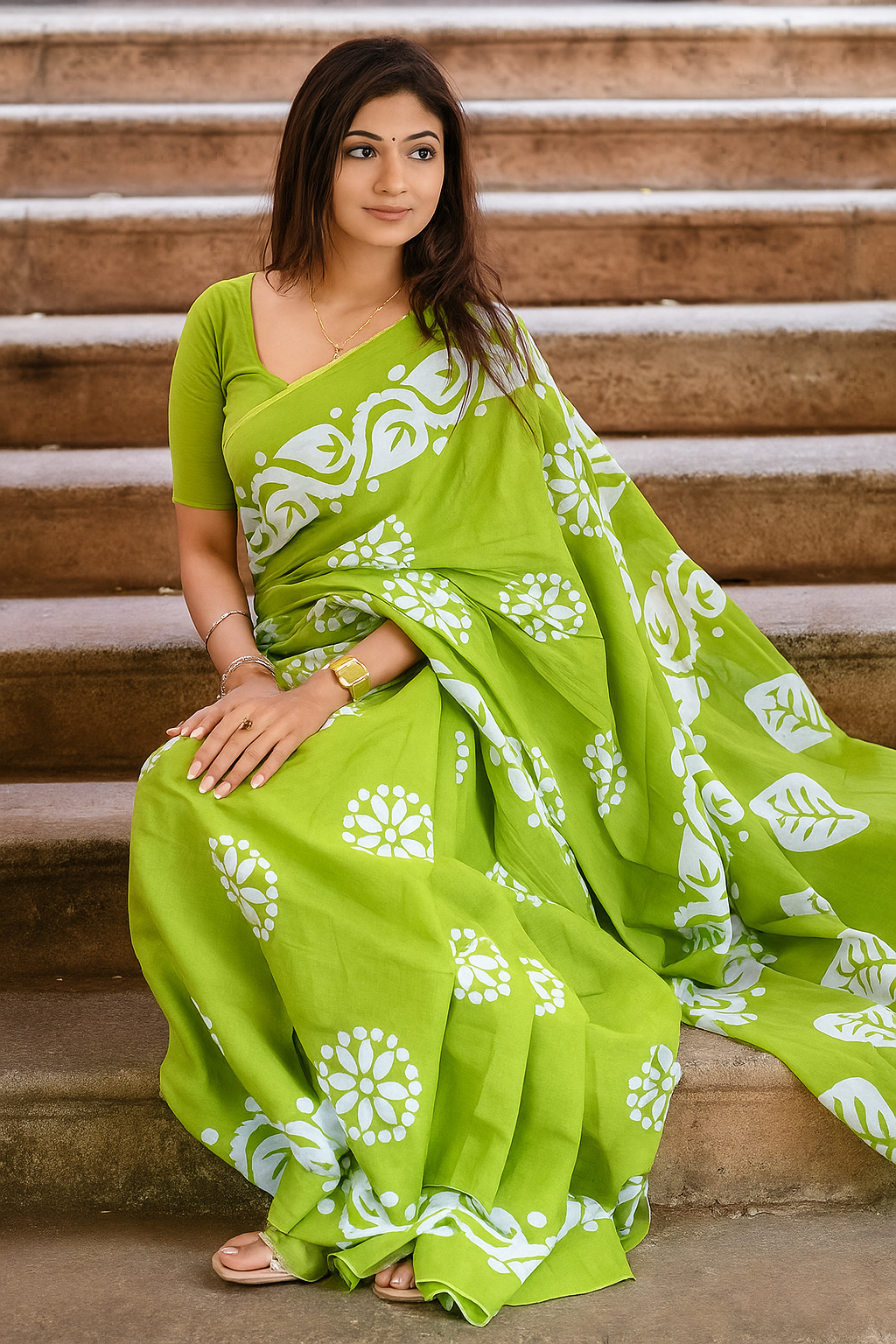 Prakriti Drape Cotton Mulmul Jaipuri Printed Saree with Matching Blouse – Hand-Dyed & Hand-Printed – 6.4 m (Including Blouse)