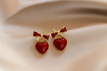 Fall in love with this adorable pair of red heart-shaped drop earrings featuring a glossy finish, tiny faux pearl, and a sparkling bow top. These Korean fashion inspired earrings are perfect for college girls, date nights, gifting, or adding a pop of charm to any outfit.