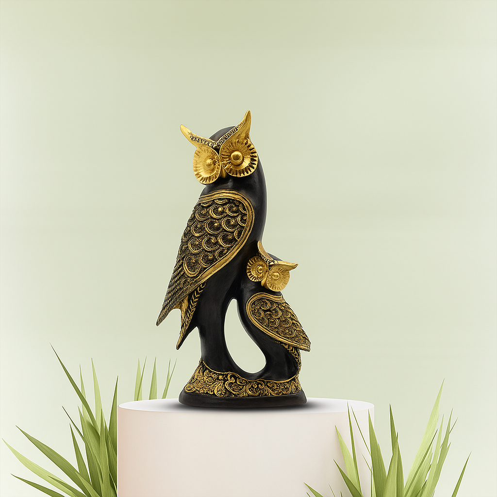 Twin Wisdom Owls – Black Polyresin Decorative Statue for Tabletop Decor